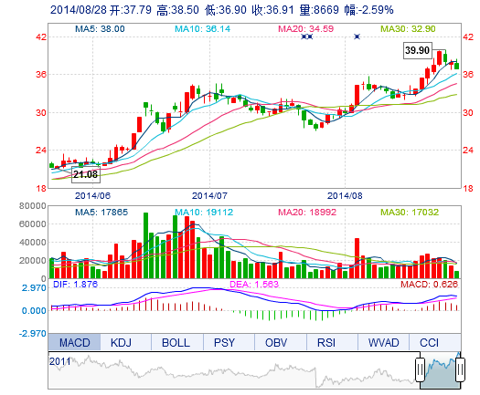 今開: 37.79 成交量: 8669手 振幅: 4.22% 最高: 38.50 成交額: 3267.69萬(wan) 元 換手率: 2.39% 最低: 36.90 總市值: 25.84億(yi) 市淨率: 8.79 昨收: 37.89 流通市值...