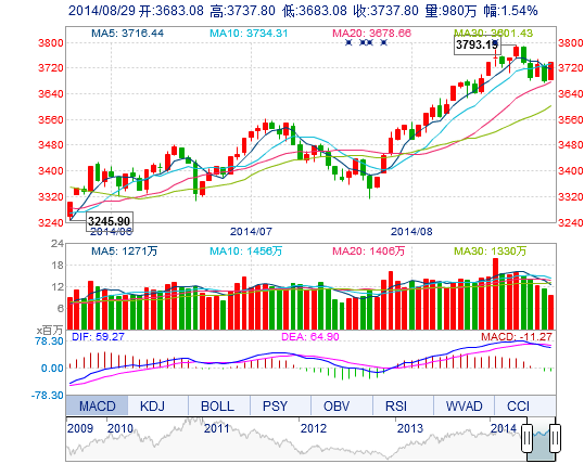 今開: 3683.08 最高: 3737.80 昨收: 3681.09 最低: 3683.08 成交量: 979.98萬(wan) 手 振幅: 1.49% 成交額: 178.47億(yi) 元