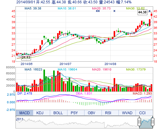 | 最 高: | 44.38 | 成交額: | 1.05億元 | 換手率: | 6.77% |