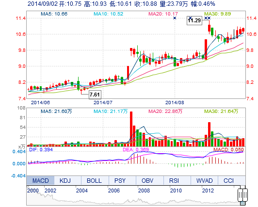 今開: 10.75 成交量: 23.79萬(wan) 手 振幅: 2.95% 最高: 10.93 成交額: 2.56億(yi) 元 換手率: 5.45% 最低: 10.61 總市值: 47.52億(yi) 市淨率: 3.37 昨收: 10.83 流通市值...