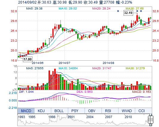 | 今 開: | 30.63 | 成交量: | 2.77萬手 | 振 幅: | 3.53% |