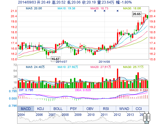 今開: 20.49 成交量: 23.64萬(wan) 手 振幅: 2.24% 最高: 20.52 成交額: 4.79億(yi) 元 換手率: 2.47% 最低: 20.06 總市值: 213.16億(yi) 市淨率: 5.79 昨收: 20.56 流通市值...