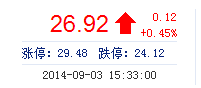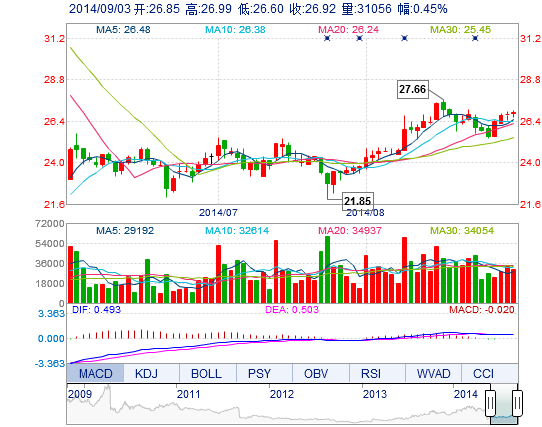 今開: 26.85 成交量: 3.11萬(wan) 手 振幅: 1.46% 最高: 26.99 成交額: 8327.35萬(wan) 元 換手率: 0.59% 最低: 26.60 總市值: 175.91億(yi) 市淨率: 9.67 昨收: 26.80 流通市...