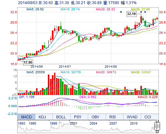 | 今 開: | 30.60 | 成交量: | 1.76萬手 | 振 幅: | 3.57% |
