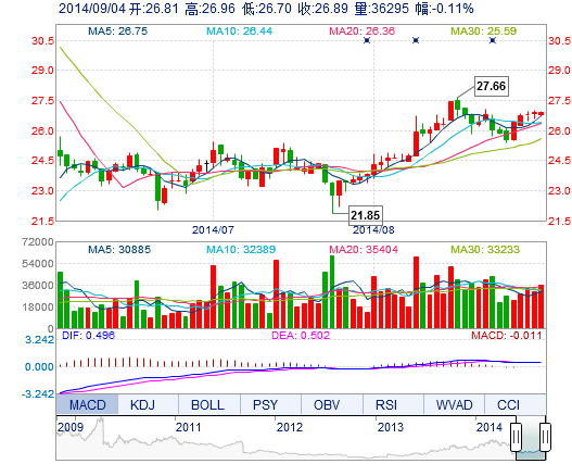| 今 開: | 26.81 | 成交量: | 3.63萬手 | 振 幅: | 0.97% |