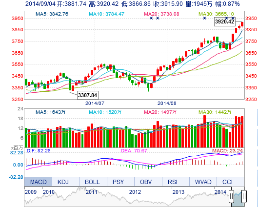 今開: 3881.74 最高: 3920.42 昨收: 3882.27 最低: 3866.86 成交量: 1944.96萬(wan) 手 振幅: 1.38% 成交額: 365.49億(yi) 元