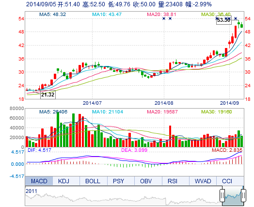 | 今 開: | 51.40 | 成交量: | 2.34萬手 | 振 幅: | 5.32% |