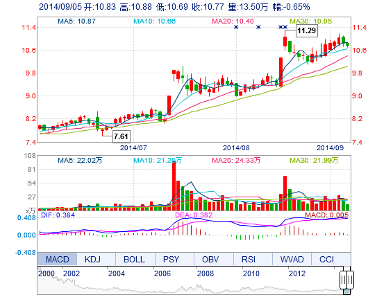 | 今 開: | 10.83 | 成交量: | 13.50萬手 | 振 幅: | 1.75% |