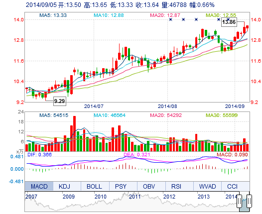 | 今 開: | 13.50 | 成交量: | 4.68萬手 | 振 幅: | 2.36% |