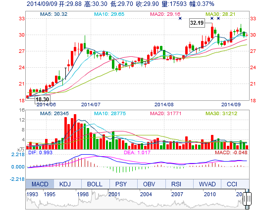 | 今 開: | 29.88 | 成交量: | 1.76萬手 | 振 幅: | 2.01% |