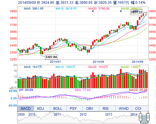 今開: 3924.86 最高: 3931.33 昨收: 3920.88 最低: 3890.66 成交量: 1661.11萬(wan) 手 振幅: 1.04% 成交額: 284.95億(yi) 元