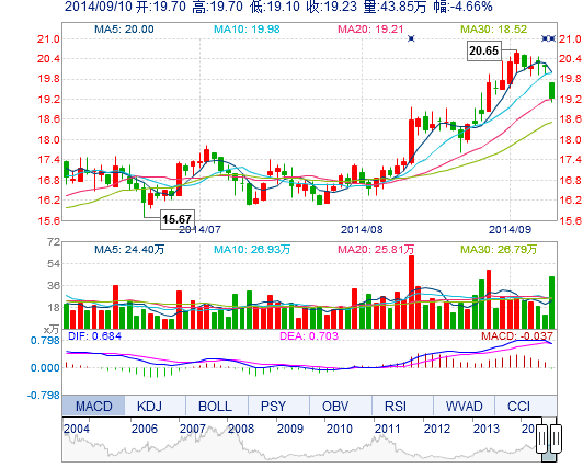 | 今 開: | 19.70 | 成交量: | 43.85萬手 | 振 幅: | 2.97% |