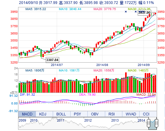 今開: 3917.99 最高: 3937.90 昨收: 3926.35 最低: 3895.98 成交量: 1721.74萬(wan) 手 振幅: 1.07% 成交額: 295.04億(yi) 元