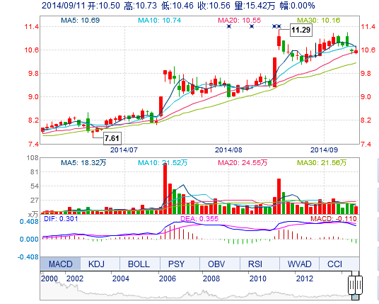 | 今 開: | 10.50 | 成交量: | 15.42萬手 | 振 幅: | 2.56% |
