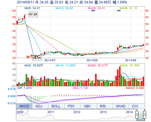 今開: 34.26 成交量: 24.88萬(wan) 手 振幅: 4.73% 最高: 35.83 成交額: 8.71億(yi) 元 換手率: 3.92% 最低: 34.21 總市值: 228.15億(yi) 市淨率: 13.42 昨收: 34.26 流通市...