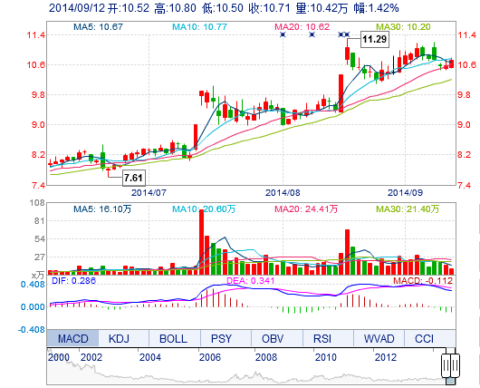 | 最 高: | 10.80 | 成交額: | 1.11億元 | 換手率: | 2.39% |