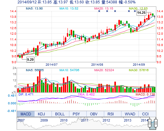 | 今 開: | 13.85 | 成交量: | 5.44萬手 | 振 幅: | 2.66% |