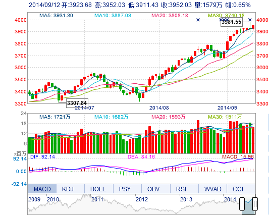 今開: 3923.68 最高: 3952.03 昨收: 3926.51 最低: 3911.43 成交量: 1578.84萬(wan) 手 振幅: 1.03% 成交額: 249.59億(yi) 元
