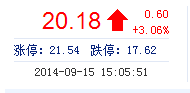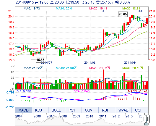 今開: 19.60 成交量: 25.15萬(wan) 手 振幅: 4.39% 最高: 20.36 成交額: 5.02億(yi) 元 換手率: 2.63% 最低: 19.50 總市值: 213.05億(yi) 市淨率: 5.79 昨收: 19.58 流通市值...