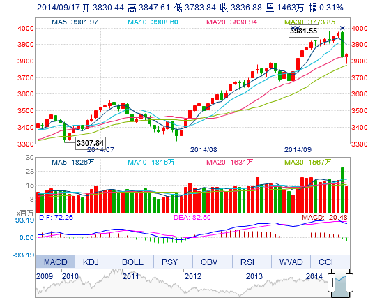 今開: 3830.44 最高: 3847.61 昨收: 3825.16 最低: 3783.84 成交量: 1462.89萬(wan) 手 振幅: 1.67% 成交額: 226.28億(yi) 元