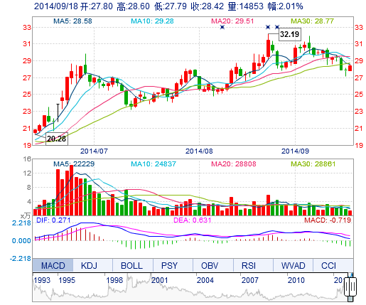 | 今 開: | 27.80 | 成交量: | 1.49萬手 | 振 幅: | 2.91% |