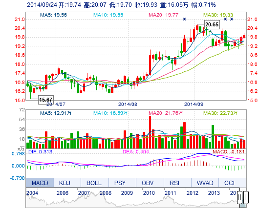 今開: 19.74 成交量: 16.05萬(wan) 手 振幅: 1.87% 最高: 20.07 成交額: 3.19億(yi) 元 換手率: 1.68% 最低: 19.70 總市值: 210.41億(yi) 市淨率: 5.71 昨收: 19.79 流通市值...