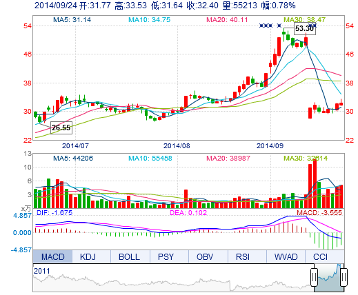 今開: 31.77 成交量: 5.52萬(wan) 手 振幅: 5.88% 最高: 33.53 成交額: 1.80億(yi) 元 換手率: 8.46% 最低: 31.64 總市值: 40.82億(yi) 市淨率: 7.72 昨收: 32.15 流通市值:...