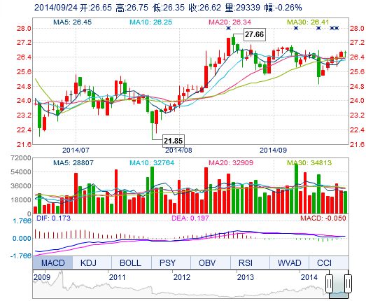 今開: 26.65 成交量: 2.93萬(wan) 手 振幅: 1.50% 最高: 26.75 成交額: 7786.11萬(wan) 元 換手率: 0.56% 最低: 26.35 總市值: 173.95億(yi) 市淨率: 9.56 昨收: 26.69 流通市...