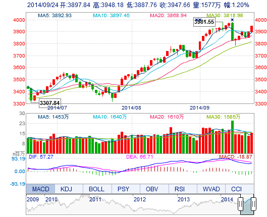 今開: 3897.84 最高: 3948.18 昨收: 3901.00 最低: 3887.76 成交量: 1577.38萬(wan) 手 振幅: 1.55% 成交額: 264.48億(yi) 元