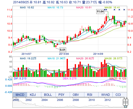 | 今 開: | 10.81 | 成交量: | 23.71萬手 | 振 幅: | 2.68% |