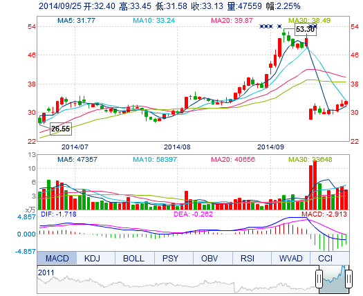 今開: 32.40 成交量: 4.76萬(wan) 手 振幅: 5.77% 最高: 33.45 成交額: 1.55億(yi) 元 換手率: 7.29% 最低: 31.58 總市值: 41.74億(yi) 市淨率: 7.89 昨收: 32.40 流通市值:...