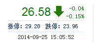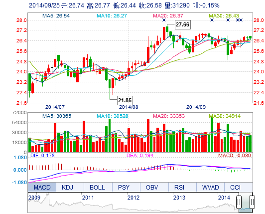 今開: 26.74 成交量: 3.13萬(wan) 手 振幅: 1.24% 最高: 26.77 成交額: 8321.69萬(wan) 元 換手率: 0.60% 最低: 26.44 總市值: 173.69億(yi) 市淨率: 9.55 昨收: 26.62 流通市...