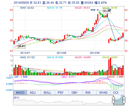 今開: 32.81 成交量: 6.53萬(wan) 手 振幅: 11.26% 最高: 36.44 成交額: 2.31億(yi) 元 換手率: 10.00% 最低: 32.71 總市值: 45.27億(yi) 市淨率: 8.56 昨收: 33.13 流通市值...