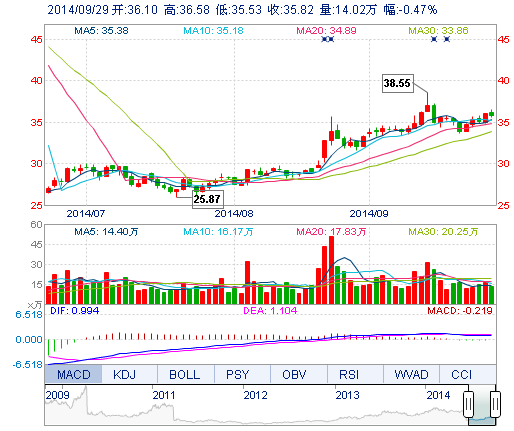 今開: 36.10 成交量: 14.02萬(wan) 手 振幅: 2.92% 最高: 36.58 成交額: 5.05億(yi) 元 換手率: 2.21% 最低: 35.53 總市值: 234.57億(yi) 市淨率: 13.80 昨收: 35.99 流通市...