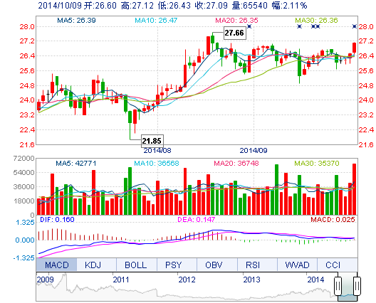 | 今 開: | 26.60 | 成交量: | 6.55萬手 | 振 幅: | 2.60% |