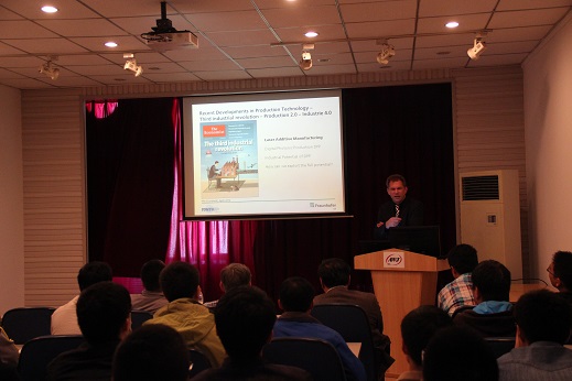9月18日上午,Prof. Ingomar Kelbassa受聘我校客座教授儀(yi) 式在行政樓121會(hui) 議室舉(ju) 行,副校長安實為(wei) Prof. Ingomar Kelbassa頒發聘書(shu) 。客座教授授銜儀(yi) 式後,陳彥賓教授向Prof. Ingomar Kelbassa介紹了重點實驗室的整體(ti) 情況,並就雙方在有關(guan) 領域的合作深入交換了意見。Prof. Ingomar Kelbassa在激光增材製造領域有13年的研究經曆,在國際上享有較高的學術地位和影響力。接著Prof. Ingomar Kelbassa為(wei) 重點實驗室師生做題目為(wei) ”Laser Additive Manufacturing”的講座,他首先介紹了激光增材製造技術的潛力及發展趨勢,接著列舉(ju) 了激光增材製造在航空航天、汽車製造等行業(ye) 的應用,介紹了Fraunhofer ILT在激光增材製造技術方麵的研究成果,最後提出了自己對該技術的獨特看法。廣大師生與(yu) Prof. Ingomar Kelbassa就激光增材製造技術的相關(guan) 問題開展熱烈的討論。