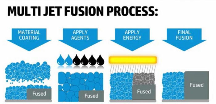該技術的工作方式很有趣:先鋪一層粉末,然後噴射熔劑,與(yu) 此同時還會(hui) 噴射一種精細劑(detailing agent),以保證打印對象邊緣的精細度,然後再在上麵施加一次熱源。這一層就算完成了。以此類推,直到3D對象完成。(見下圖)