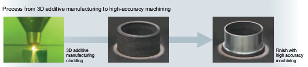 在操作中,INTEGREX I-400AM在噴嘴前端向工件表麵噴出金屬粉末、同時照射纖維激光,在各母材上熔融、凝固金屬粉末。這種方法還能將母材與(yu) 其他金屬強力接合起來。比如,在作為(wei) 母材的“Inconel738”上,對用於(yu) 航空領域部件的鎳基超合金“Inconel718”實施沉積成型。因此可用於(yu) 修複磨損或損壞的零部件,如航空渦輪葉片等。