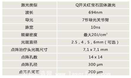 黑色素對波長為(wei) 694nm的紅寶石激光吸收最高,可充分作用於(yu) 病變的細胞組織。點陣模式在皮膚上打出很多治療作用的微孔,並且保存了周圍皮膚的完好,縮短了術後的恢複時間;同時,減少了對病變組織的刺激,減少症狀複發的幾率。