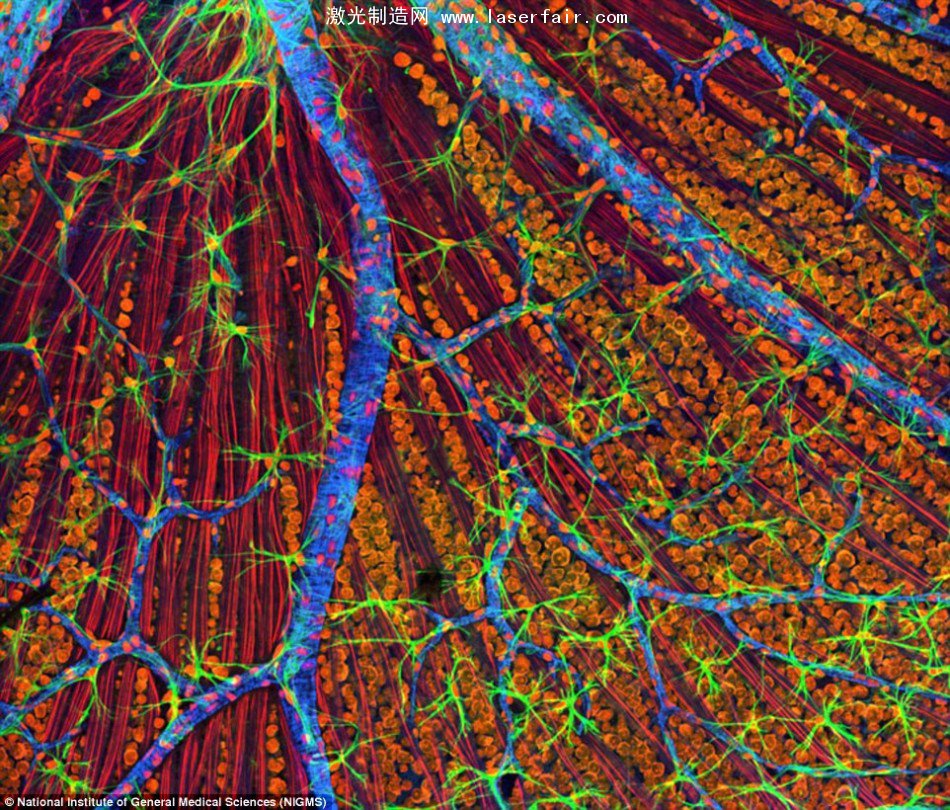 激光掃描顯微鏡會(hui) 逐點掃描樣品表麵,並將一個(ge) 個(ge) 像素的信息最終合成一副完整圖像,這樣就能得到一副三維立體(ti) 的高分辨率圖像。這裏展示的是老鼠的視網膜,其中的細胞已經經過染色以便顯示不同結構的細節。