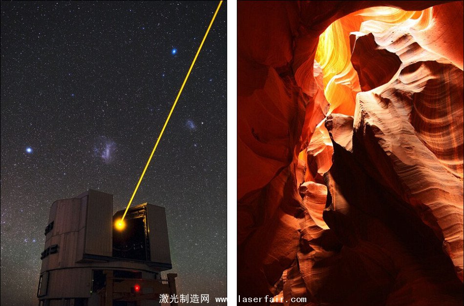 所有激光的原理都在於(yu) 控製原子釋放光子的方式。激光可以讓光的能量集中在很小的範圍內(nei) 並照射到相對遙遠的目標。在左圖中,天文學家們(men) 利用激光測量地球大氣層擾動,從(cong) 而為(wei) 望遠鏡修正光學誤差作為(wei) 參考;而右圖展示的則是美國亞(ya) 利桑那州的羚羊峽穀(Antelope Canyon)