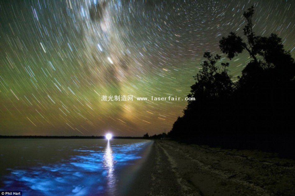這項展覽的目的旨在提醒人們(men) 光學科技所取得的巨大成就,它的應用以及它對於(yu) 人類的重要意義(yi) 。這張照片呈現的是澳大利亞(ya) 東(dong) 南部吉普斯蘭(lan) 湖(Gippsland Lakes)美景——水中生物發出的淡淡熒光以及上空的銀河。