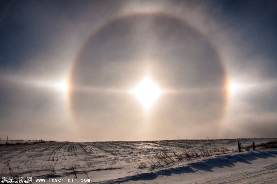 這張照片展示的是所謂“幻日”現象,此時太陽的兩(liang) 側(ce) 都分別出現了兩(liang) 個(ge) 明亮的點,這種光學現象比較多會(hui) 發生在日落時分。這主要是由空氣中的冰晶彎曲陽光後導致的結果,這些冰晶是棱鏡狀的。如果這些冰晶在大氣中的朝向是隨機的,那麽(me) 太陽周圍就會(hui) 出現一個(ge) 完整的圓形。
