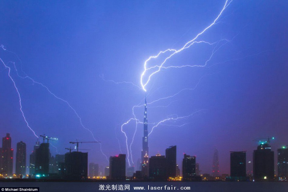 在本次展覽中還有城市上空發生的閃電場景,比如這張照片,拍攝的地點是在迪拜的哈利法塔。