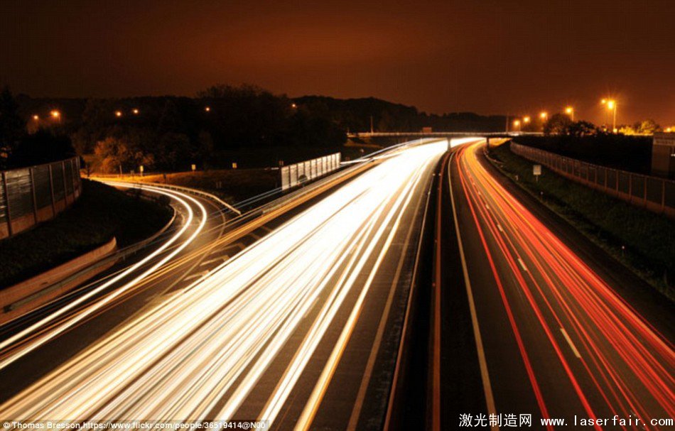 最早期的汽車車燈使用的是煤油或乙炔,而今天的汽車車燈則早已變得更加安全而有效。最新的汽車使用LED燈而不是白熾燈。這張照片由8張照片合成,每張曝光30秒,展示的是路上繁忙的交通。