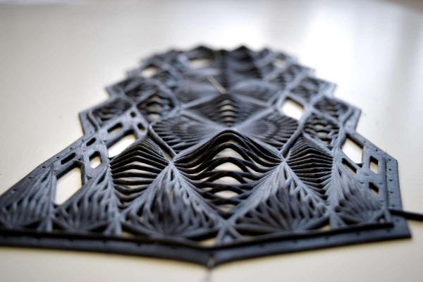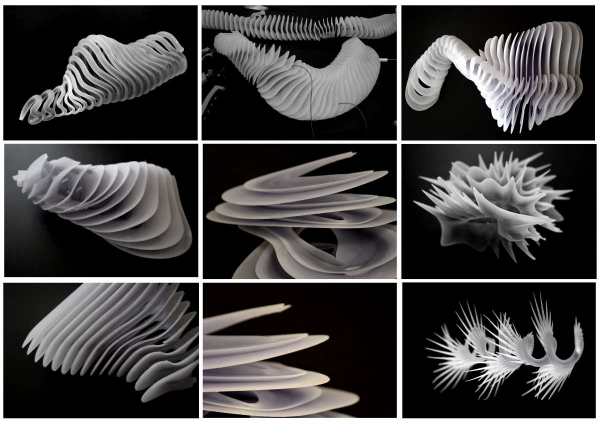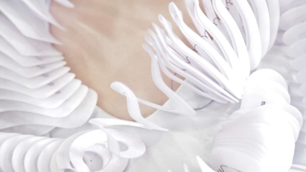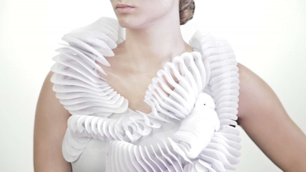 Van Dongen 的第二個(ge) 3D 打印項目 Ruff 是與(yu) 建築師 Behnaz Farahi 合作的。他們(men) 想要用 3D 打印技術來創造一個(ge) 圍繞身體(ti) 移動的動態的、靈活的形體(ti) 。不過,用於(yu) 3D 打印的材料通常很僵硬,很容易破裂。為(wei) 了解決(jue) 這一問題,van Dongen 和 Farahi 嚐試了打印多個(ge) 彈簧一樣的塑料形體(ti) 。這些結構要更耐用、更柔韌。
