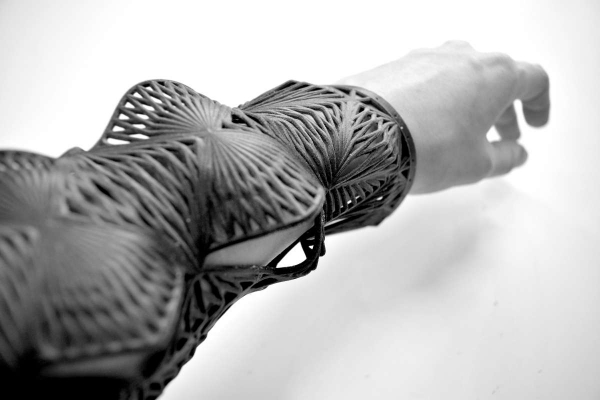 Van Dongen 第一次嚐試用 3D 打印技術製作的時尚作品比較簡單:她打印了一個(ge) 袖套。但她不想要一個(ge) 隻起到遮蓋作用的袖套,於(yu) 是她將袖套設計成可伸縮形態。Van Dongen 用一台 Objet Connex 多材料打印機打印了這一袖套。袖套由具有彈性、像橡膠一樣的材料和結實的塑料構成。