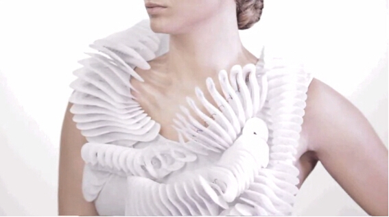 Van Dongen 和 Farahi 通過與(yu) 3D Systems 公司位於(yu) 洛杉磯的工作室合作,製作了這件“響應式可穿戴服裝”。服裝的彈簧式結構纏繞在身體(ti) 之上,給人一種深海珊瑚在海中移動的美感。