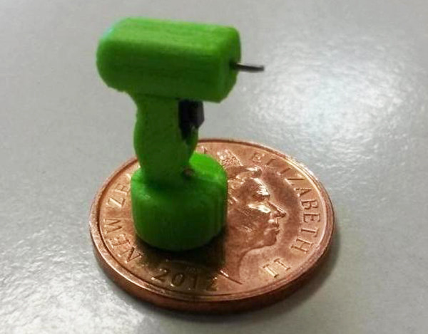 迷你電鑽的外殼由兩(liang) 片外殼和一個(ge) 固定馬達軸的卡盤三部分組成,打印所有部件總共用時25分鍾左右。Abernethy用助聽器上的電池作為(wei) 電源,並安裝了一個(ge) 小按鈕和一台微型電動機,再將耳機線剝開用於(yu) 內(nei) 部的接線。