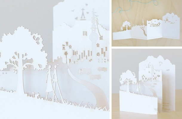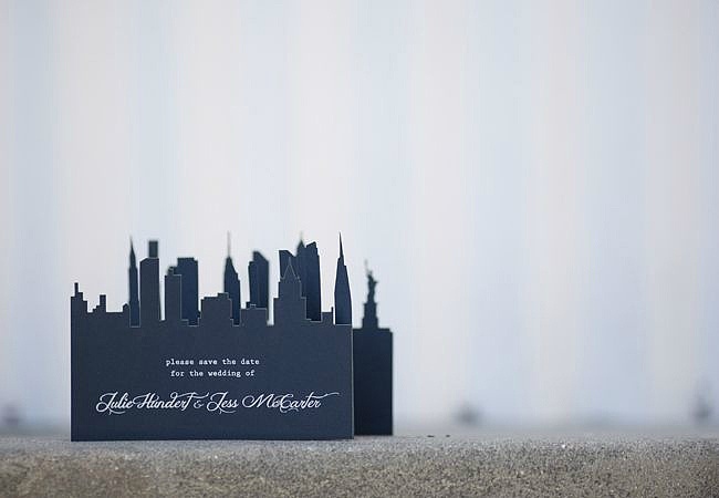 激光切割技術能讓請柬有更複雜的花樣,它的效果類似於(yu) 傳(chuan) 統的中國剪紙。你的婚禮請柬完全可以摒棄四四方方的外形,而采用一種另類的造型,比如將請柬切割出上圖中的紐約城空中輪廓線,又或是在封裝上增加激光切割的細節,製作奇妙美麗(li) 的腰封、信封或封套。